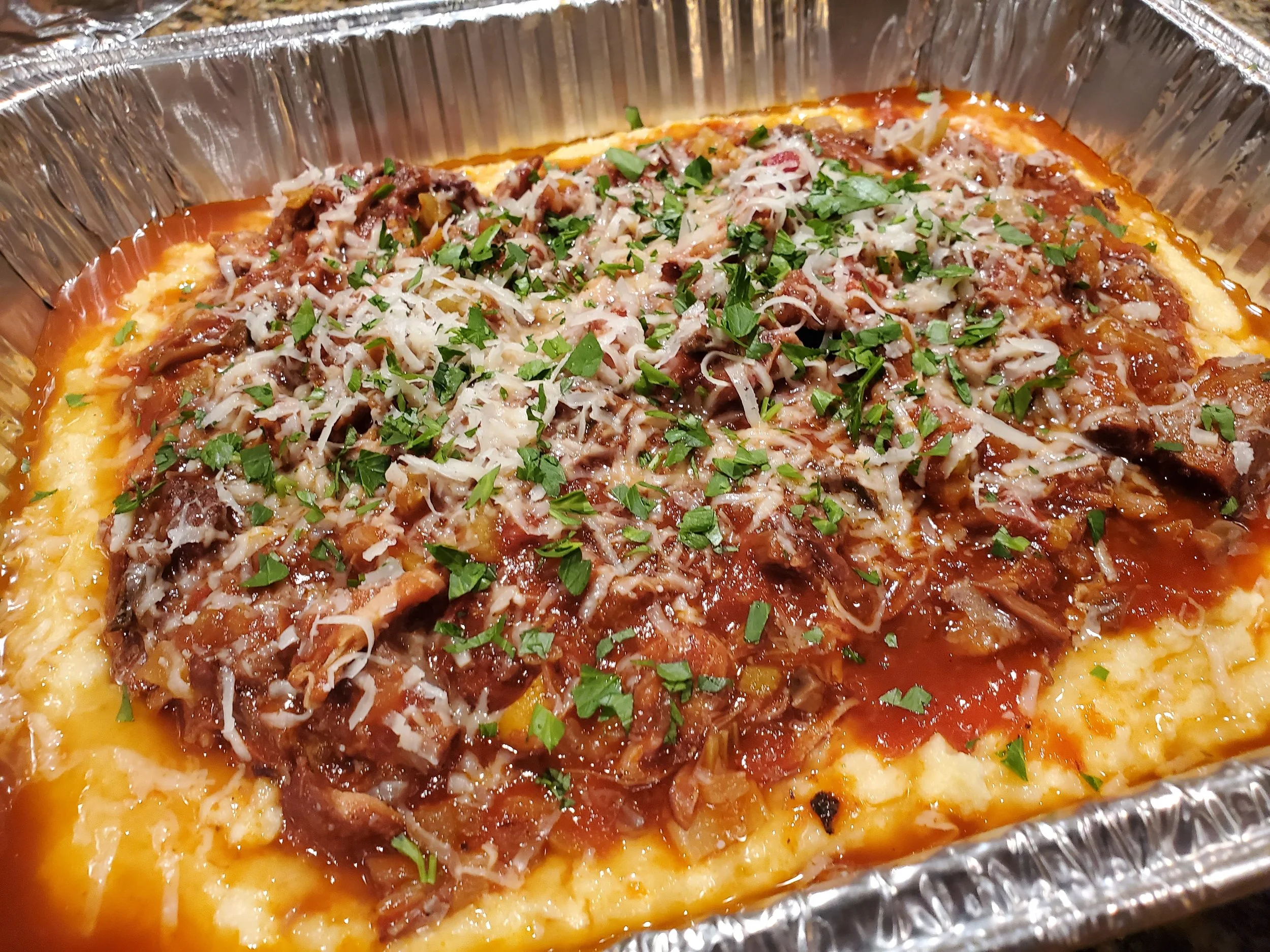 slow-cooked pork with san Marzano tomatoes, celery & carrots topped with grated grana Padano cheese & served with your choice of parmesan & asiago polenta or fresh, handmade pappardelle. comes with choice of salad & warm bread with whipped lemon ricotta
