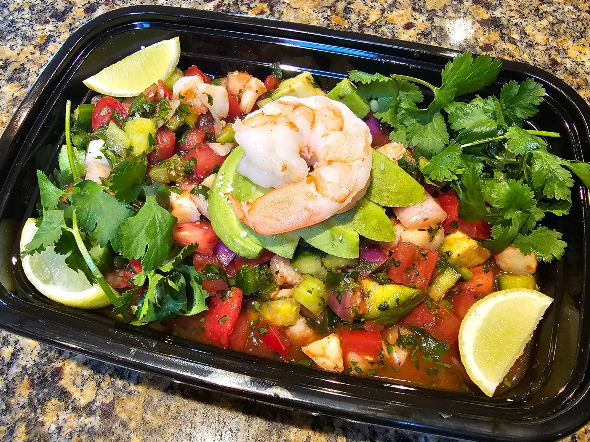 chilled (cooked) jumbo shrimp in a mexican-inspired shrimp cocktail full of fresh ripe tomatoes, avocado, jalapenos, cucumbers & cilantro. comes with a cup of chicken, rice & cilantro soup, guacamole, fresh limes, tostadas & romaine, corn & mango salad